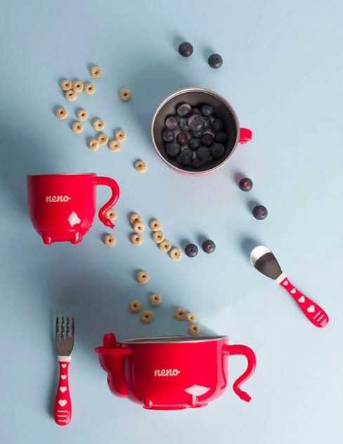 Neno Mucca är en komplett barnservis för din bebis. Kitet innehåller två skålar, en kopp, gaffel och en sked - perfekt när barnet ska lära sig att äta själv. I setet ingår även en inbyggd sugkopp att förhindra små kladdiga olyckor. Den innovativa värme- och kyltekniken gör det enkelt för dig att servera måltider med rätt temperatur.