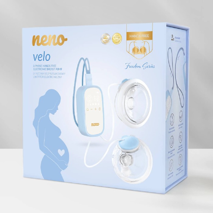 NENO Breast Pump Electric Hands Free Velo är en batteridriven, handsfree dubbel-bröstpump med tre lägen, framtagna för att efterlikna barnets naturliga sugmönster.