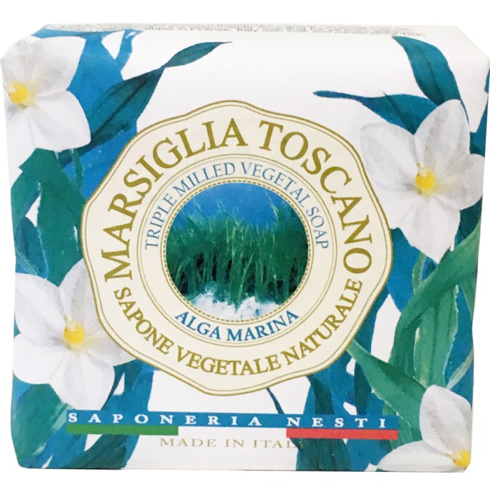 Nesti Dante Marsiglia Toscano Alga Marina är en tvål tillverkad med naturliga ingredienser i en lång tillverkningsprocess. I sin anrika tvåltillverkning har Nesti Dante alltid prioriterat högsta kvalitet, och hårdtvålarna i Marsiglia-kollektionen är släta, lena och innehåller doftnoter som för tankarna till Toscanas skönhet.