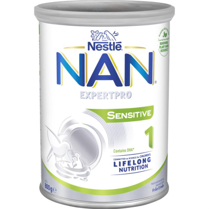 Nestlé NAN ExpertPro Sensitive 1 är en modersmjölksersättning baserad på mjölk som kan ges från födseln. NAN ExpertPro Sensitive 1 används som tillägg till eller ersättning för bröstmjölk enligt rekommendation av BVC eller barnläkare och täcker näringsbehovet upp till 6 månaders ålder. Innehåller dokosahexaensyra*. (*Obligatoriskt enligt lag för all modersmjölksersättning.) Pulver i burk med 800 gram.