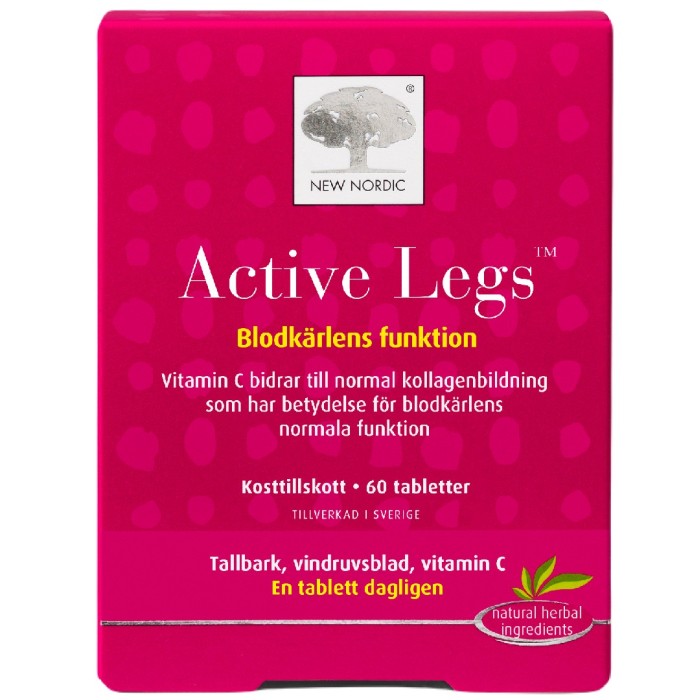 Active Legs är ett kosttillskott som innehåller utvalda örtextrakt från bark av medelhavstall och vindruvsblad. Active Legs innehåller vitamin C som bidrar till normal kollagenbildning som har betydelse för blodkärlens normala funktion.