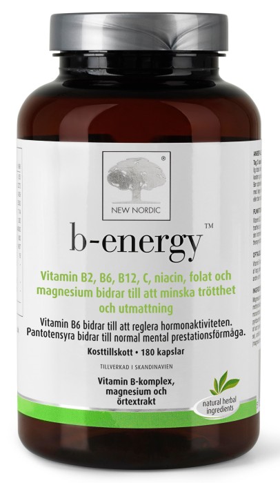 B-Energy från New Nordic är ett kosttillskott som innehåller vitamin B2, B6, B12, vitamin C, folat och magnesium vilka bidrar till att minska trötthet och utmattning. Vitamin B6 bidrar även till reglering av hormonell aktivitet och normal psykologisk funktion. Pantotensyra bidrar till normal mental prestationsförmåga.