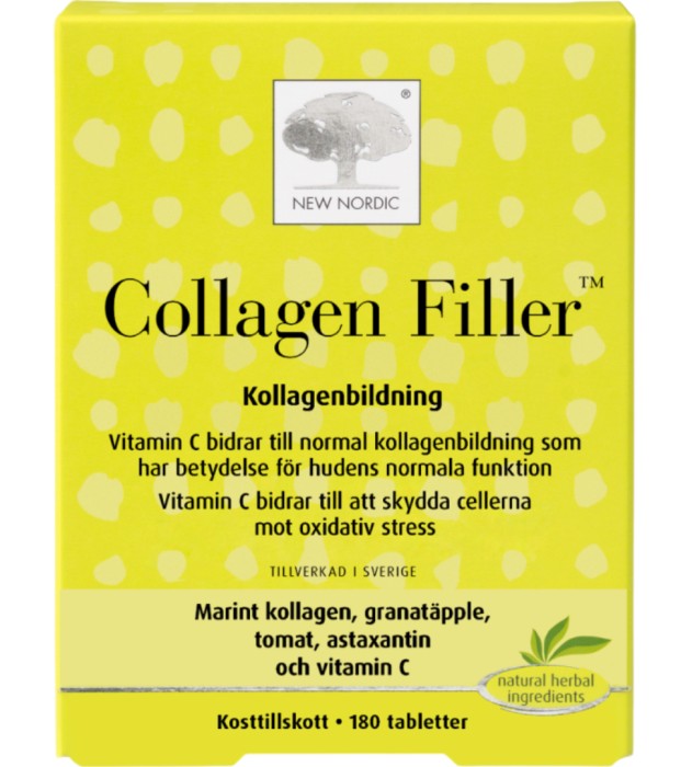 New Nordic Collagen Filler är ett kosttillskott med marint kollagen och örtextrakt. Collagen Filler innehåller även C-vitamin som bidrar till normal kollagenbildning som har betydelse för hudens normala funktion. Vitamin C bidrar även till att skydda cellerna mot oxidativ stress. Tillverkad i Sverige.