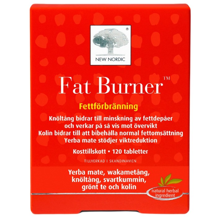 New Nordic Fat Burner är en örtbaserat kosttillskott med yerba mate tillsammans med wakame, knöltång, svart kumminfrö och grönt te. Kosttillskottet innehåller dessutom kolin, som bidrar till att bibehålla normal fettomsättning.