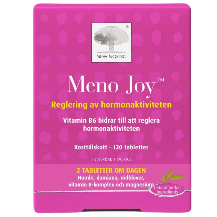 Meno Joy är ett örtbaserat kosttillskott för kvinnor i övergångsåldern. Meno Joy innehåller en kombination av ingredienser som humle, damiana och rödklöver samt vitamin B-komplex och magnesium. Vitamin B6 bidrar till reglering av hormonaktiviteten.