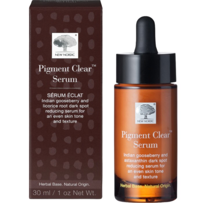 Pigment Clear™ Serum från New Nordic är ett ansiktsserum baserat på indiskt krusbär, mullbärsblad, lakritsrot och astaxantin. Serumet hjälper till att korrigera pigmentfläckar, ojämn hudton och struktur. Pigment Clear serum gör huden smidig och ger fukt och lyster. Ett veganskt serumet som är utvecklat och tillverkat i Sverige.