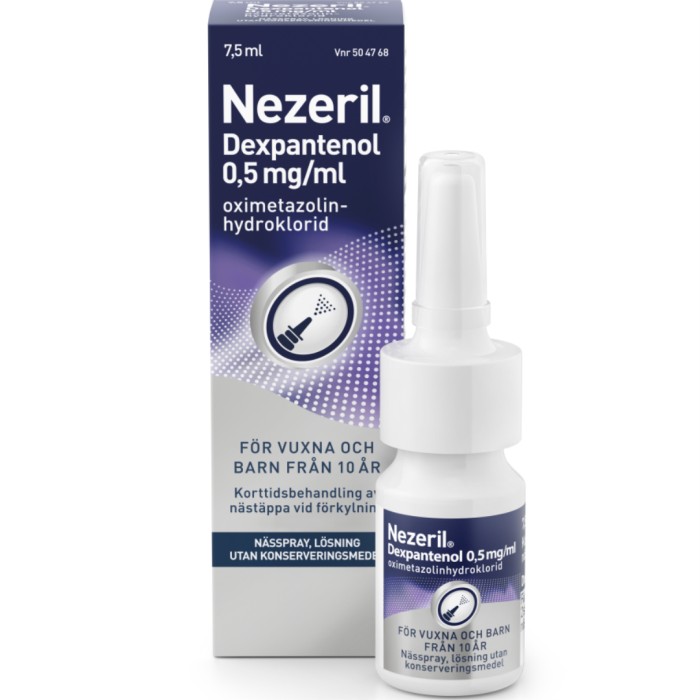Nezeril Dexpantenol är en avsvällande nässpray som används för korttidsbehandling av nästäppa vid förkylning. Nezeril Dexpantenol har en snabbt avsvällande effekt för att minska nästäppa och underlätta andningen. Effekten kommer inom några minuter och varar upp till 12 timmar. Nässprayen innehåller även dexpantenol som verkar fuktgivande på nässlemhinnan.