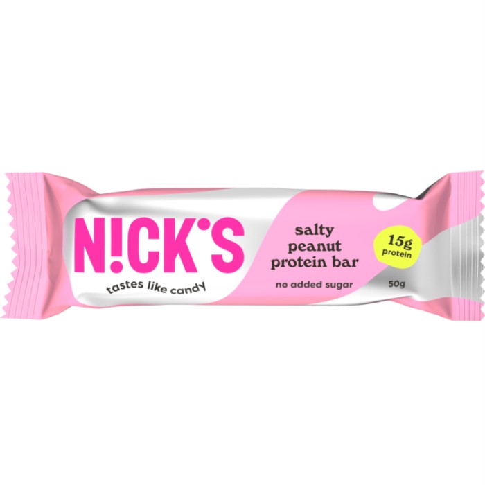 Nick's Protein Bar Salty Peanut är en proteinbar som innehåller karamell, salta jordnötter och är täckt av mjölkchoklad. En bar med 30 % mjukt protein, utan tillsatt socker. Innehåller sötningsmedel.
