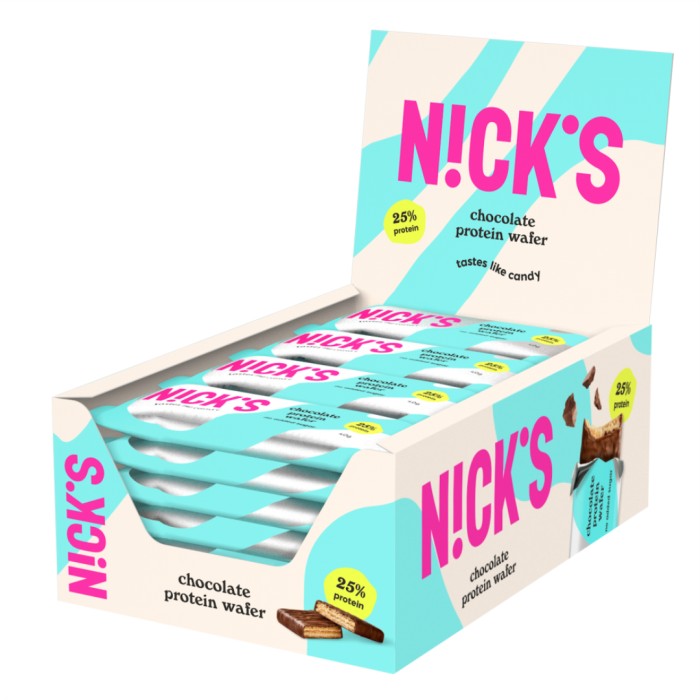 Nicks Chocolate Protein Wafer är en krispig protein-wafer med choklad, som innehåller vitaminer och prebiotiska fiber. Wafern innehåller 30% protein. Innehåller sötningsmedel.