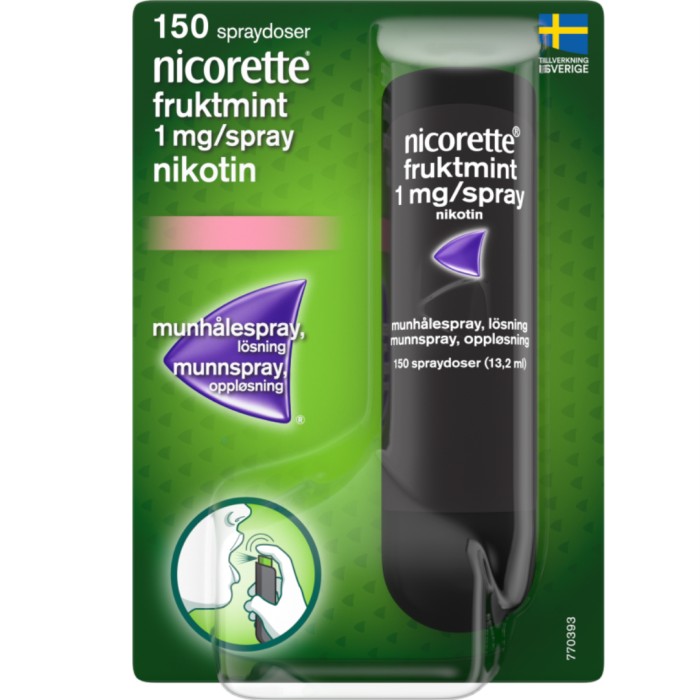 Nicorette Fruktmint munhålespray är ett nikotinläkemedel för dig som vill sluta röka. Nicorette Fruktmint sprayas in i munhålan när rökbegär uppstår. Med smak av frukt & mint.