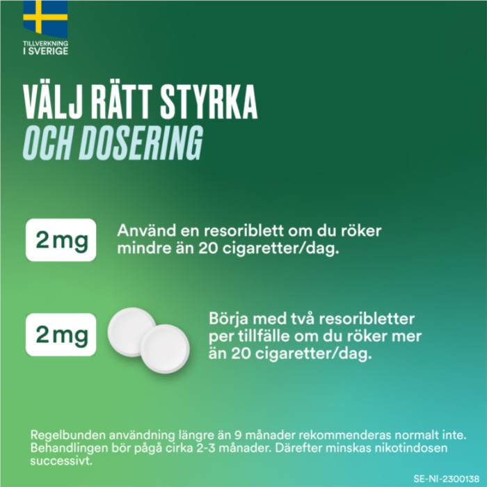 Doseringen ska väljas med utgångspunkt från ditt nikotinberoende. I början av behandlingen kan 1 tablett Nicorette Microtab tas varje till varannan timme. I de flesta fall är 8-12 resoribletter per dag tillräckligt. Vid högt nikotinberoende eller om du röker mer än 20 cigaretter per dag börja med 2 tabletter varje till varannan timme. Högst 30 tabletter per dag bör användas. Nicorette Microtab ska placeras under tungan och den får sedan långsamt smälta med hjälp av saliven. Detta tar cirka en halvtimme. Behandlingstiden är individuell men bör pågå cirka 2-3 månader. Därefter minskas nikotindosen successivt. Behandlingen bör avslutas när dosen minskat till 1-2 resoribletter per dag. Regelbunden användning av Nicorette Microtab längre än 6 månader rekommenderas normalt inte. I vissa fall kan längre behandlingstid vara nödvändig för att undvika återfall till rökning.
