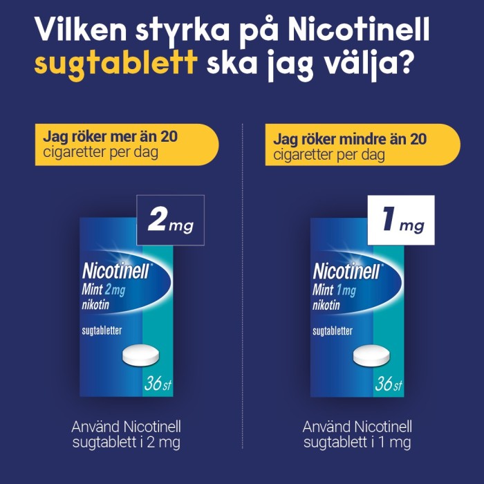 Vilken styrka ska du börja med? Om du röker under 20 cigaretter om dagen: 1 mg sugtablett. Om du röker mer än 20 cigaretter om dagen: 1-2 mg sugtablett. Om du röker mer än 30 cigaretter om dagen: 2 mg sugtablett. Så använder du Nicotinell sugtablett: 1. Sug tills nikotinsmaken blir stark. 2. Vila sugtabletten i kinden tills smaken avtar. 3. När smaken avtar, kan du börja suga igen. 4. Upprepas i ca 30 minuter tills tabletten tar slut. Hur många och hur länge? Ta en sugtablett när du känner röksug, vanligen 8-12 sugtabletter per dag. Största dygnsdos vid användning av 2 mg sugtablett är 15 och av 1 mg sugtablett 30 sugtabletter. Fortsätt att använda sugtabletterna i upp till 3 månader för att bryta rökvanan och trappa därefter gradvis ned antalet sugtabletter per dag. När den dagliga förbrukningen är 1-2 sugtabletter ska du sluta att använda sugtabletterna helt Regelbunden användning av Nicotinell sugtabletter i mer än 6 månader rekommenderas normalt inte, men vissa före detta rökare kan behöva sugtablettbehandling längre tid för att inte återgå till rökning. Kombinationsbehandling - För dig som behöver extra stöd Börja behandlingen med ett plåster 21 mg/24 timmar i kombination med Nicotinell 1 mg sugtablett. Använd minst 4 sugtabletter (1 mg) per dag. I de flesta fall är 5-6 sugtabletter tillräckligt. Använd inte mer än 15 sugtabletter per dag. I normalfallet bör behandlingen pågå under 6-12 veckor. Därefter minskas nikotindosen gradvis. Reduktion av nikotindos efter de första 6-12 veckorna: Detta kan göras på 2 sätt. Alternativ 1: Använd plåstrer med lägre styrka dvs. 14 mg/24 timmar plåstrer i 3-6 veckor följt av 7 mg/24 timmar plåstret i ytterligare 3-6 veckor tillsammans med den inledande dosen Nicotinell 1 mg sugtablett. Därefter minskas antalet sugtabletter gradvis. Längre behandlingstid än 6 månader rekommenderas normalt inte. Vissa före detta rökare kan dock behöva behandling längre för att inte återgå till rökning, behandlingen bör inte överstiga 9 månader. Alternativ 2: Avbryt behandling med plåster och minska antalet 1 mg sugtabletter gradvis. Längre behandlingstid än 6 månader rekommenderas normalt inte. Vissa före detta rökare kan dock behöva behandling längre för att inte återgå till rökning, behandlingen bör inte överstiga 9 månader. De som använder sugtabletten under längre tid än 6 månader rekommenderas att söka mer hjälp och råd från hälso-och sjukvårdspersonal.