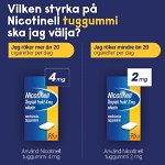 Generellt gäller följande: I början av behandlingen kan 1 tuggummi tas varje till varannan timme. I de flesta fall är 8-12 tuggummin per dag tillräckligt, oavsett styrka. Största dygnsdos vid användning av 2 mg tuggummin är 25 tuggummin och av 4 mg tuggummin 15 tuggummin. Rökavvänjning: Behandlingstiden är individuell. I normalfallet bör behandlingen pågå i minst 3 månader. Därefter reduceras nikotindosen successivt. Behandlingen bör avslutas när dosen minskat till 1-2 tuggummin per dag. Regelbunden användning av Nicotinell tuggummin längre än 1 år rekommenderas normalt inte. I vissa fall kan längre behandlingstid vara nödvändig för att undvika återfall till rökning. Rökreduktion: Nicotinell tuggummi används mellan rökperioder för att förlänga rökfria intervaller och med syftet att minska rökningen så mycket som möjligt. Om en minskning av antalet cigaretter per dag inte har uppnåtts efter 6 veckor bör professionell hjälp sökas. Försök att sluta röka bör göras så snart rökaren känner sig beredd, dock inte senare än 6 månader efter behandlingsstart. Om det inte är möjligt att göra ett allvarligt försök att sluta röka inom 9 månader efter behandlingsstart sökes professionell hjälp (t ex ”Sluta-rökalinjen” tel nr 020-84 00 00). Det är viktigt att tuggummit tuggas på rätt sätt för att undvika obehag (t.ex. hicka och halsbränna). 1.Tugga 1 tuggummi tills en kraftig smak förnims. 2.Låt sedan tuggummit vila mellan kinden och tandköttet. 3.Börja tugga igen när smaken mattas av. 4.Upprepa detta förfaringssätt under 30 minuter. Nikotineffekten inträder först efter några minuter. Tuggummit skall inte sväljas men om det sker av misstag är förgiftningsrisken liten eftersom nikotinet frisätts långsamt och ofullständigt.