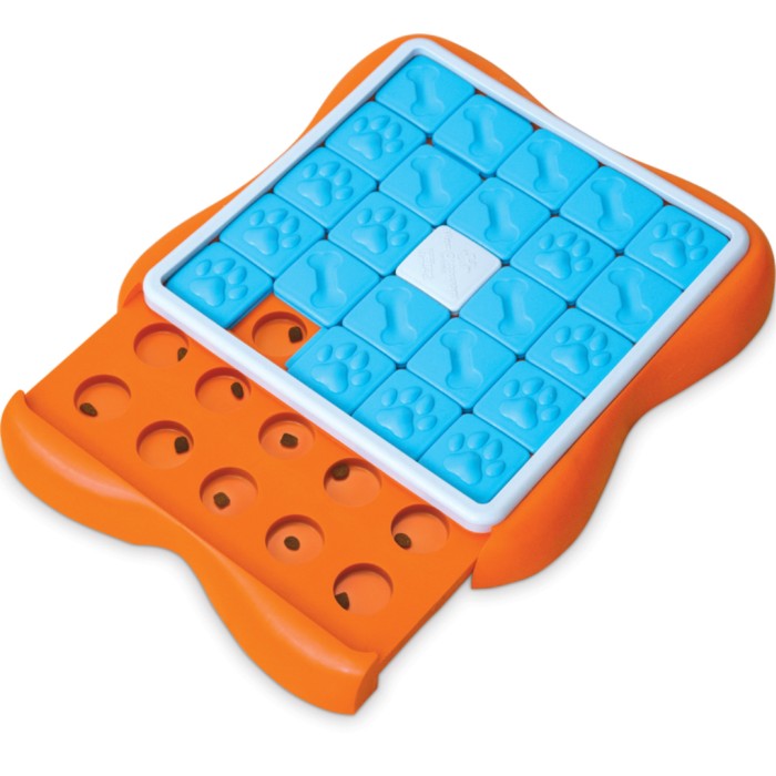 Challenge Slider har 24 dolda gömmor för godis, som hunden ska hitta genom att flytta brickor, en i taget, i olika riktningar, för att hitta gömda godbitar eller mat.