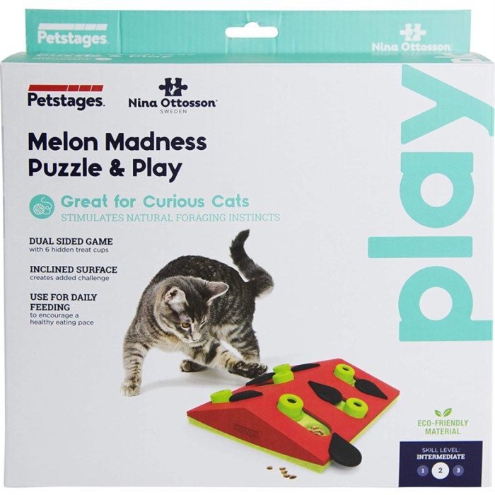 Melon Madness Puzzle & Play är en aktiveringsleksak för katt. Katten skjuter på klossarna och vrider på de svarta bitarna för att hitta godis i de 6 godisgömmorna och inuti de 6 klossarna. Spelet kan anpassas för att göra det lättare för nybörjare eller mer utmanande för smarta katter.