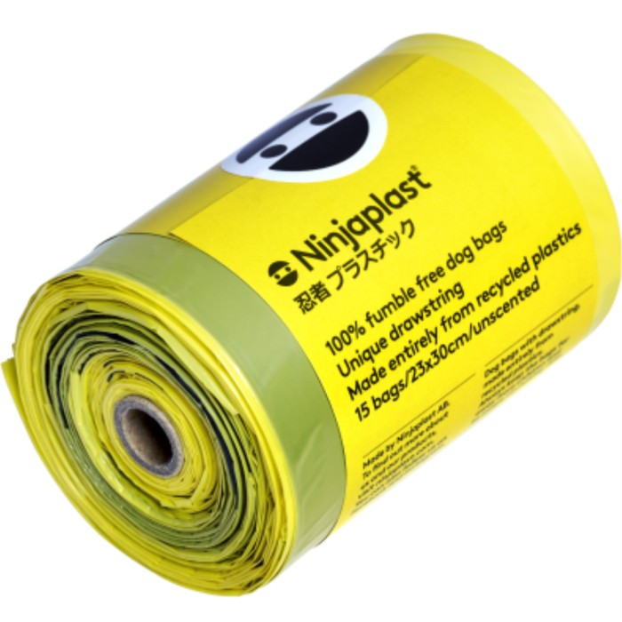 Ninjaplast hundbajspåsar med dragsnöre är slitstarka påsar utan doft. Ninjaplasts nya dragsnöres-konstruktion gör påsarna smidiga att försluta. Påsarna är tillverkade av återvunnen plast. Rullen innehåller 15 påsar.