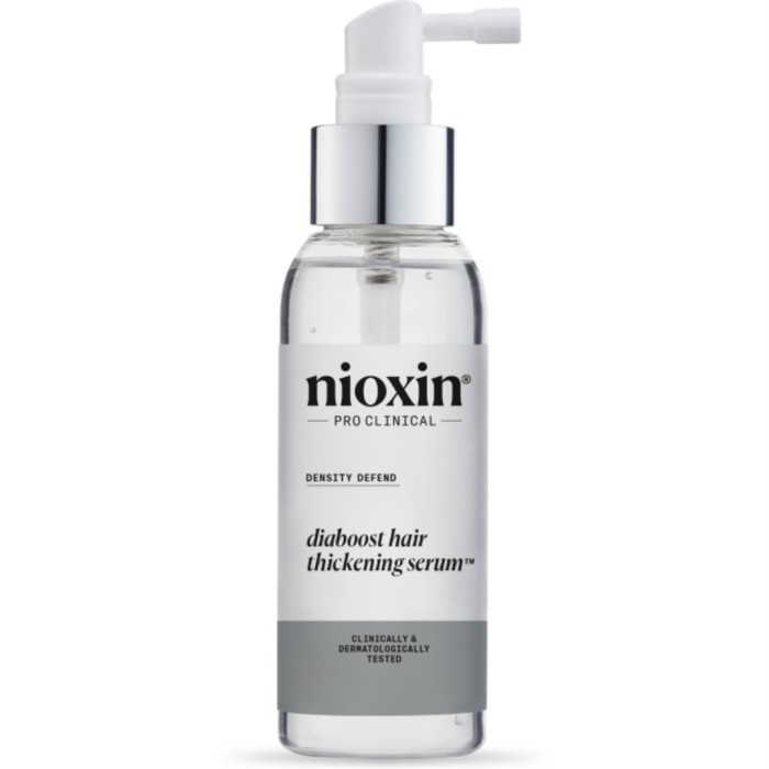 Nioxin Diaboost är ett avancerat hårförtjockande serum som direkt ger hårstråna ett tjockare utseende. Serumet motverkar tunnhårighet genom att skydda håret från att gå av och därmed hjälpa det att växa längre och starkare. Nioxin Diaboost hårserum innehåller ingredienser som koffein, vildmynta, pepparmintolja och niacinamid. Gör att håret får volym, stärks och skyddas och blir även mer lätthanterligt.