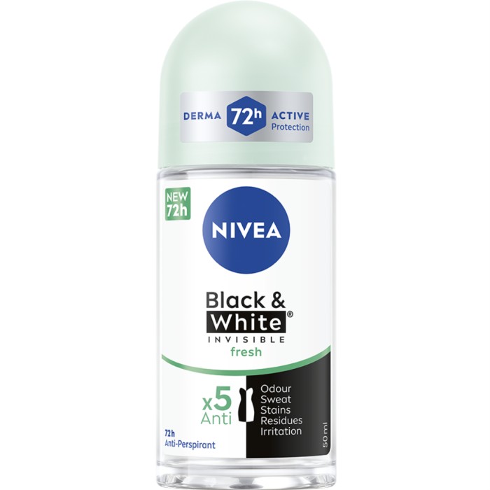 NIVEA Black & White Invisible Fresh roll-on skyddar mot lukt, svett och irritationer. Den är dermatologiskt testad. Om du föredrar en antiperspirant i annat format har NIVEA även sticks och sprayer som hjälper dig att känna dig torr och fräsch hela dagen.
