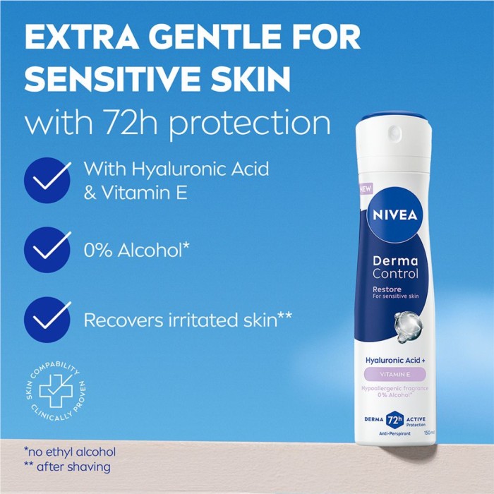 NIVEA Derma Control Restore Deo Antiperspirant är en deospray speciellt framtagen för känslig hud, och har en hypoallergen doft. Denna deospray har en formulering med ren hyaluron och vitamin E för att lugna huden och främja återhämtning efter rakning, vilket ger mjukare hud under armarna och en behaglig känsla. Antiperspiranten ger upp till 72 timmars skydd. Formuleringen arbetar med huden för att ha en pålitlig och stark effekt mot svett och lukt, samtidigt som den vårdar armhålorna. Fria från etylalkohol. Noggrant testad på känslig hud och dermatologiskt bevisat skonsam.