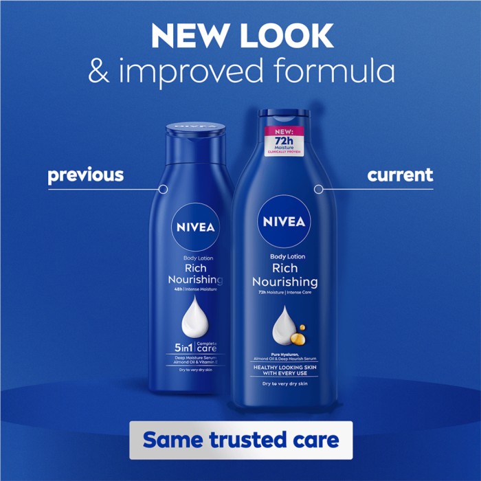 NIVEA Rich Nourishing Body Lotion är en kroppslotion för torr hud. Den nya och förbättrade formuleringen ger kliniskt bevisad återfuktning i upp till 72 timmar. Gör att huden ser hälsosam ut efter varje användning. Lotionen har en närande formulering med hyaluron, mandelolja och ett djupt närande serum. Niveas kroppslotion ger intensiv vård och passar för torr till mycket torr hud. Rich Nourishing Body Lotion är icke-kladdig och absorberas snabbt av huden. Vissa hudområden torkar ut snabbare än andra, det är därför bra att ge huden extra näring året om. Ny förbättrad flaska med mindre plast jämfört med tidigare: 50% återvunnen plastflaska (exklusive kork).