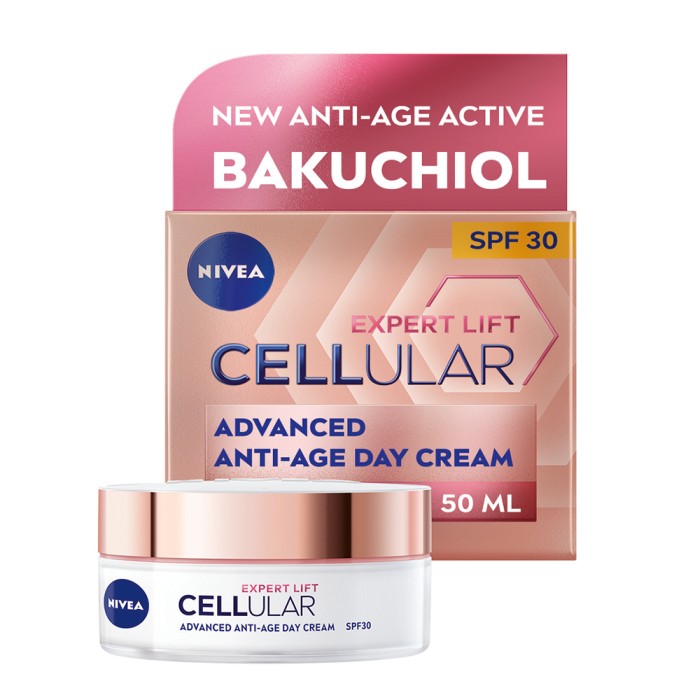 NIVEA Cellular Expert Lift Day Cream är en dagkräm med SPF 30 framtagen för att få din hud att se yngre ut. Niveas avancerade formulering innehåller en kombination av kraftfulla anti-age-substanser som arbetar på djupet i cellerna för att få huden att se yngre ut. Ren bakuchiol stödjer och boostar cellernas kollagen-aktivitet redan efter 4 timmar från applicering, och hjälper huden att stärka supporterande fibrer (testat på hudceller).