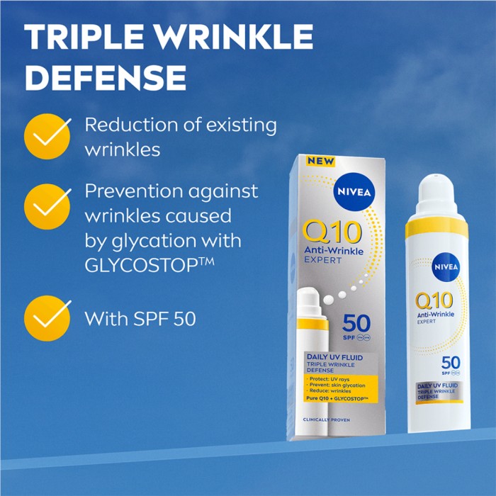 NIVEA Q10 Anti-Wrinkle Expert DAILY UV FLUID SPF50 är en ansiktskräm som ger ett skydd mot UV-strålar, förhindrar glykeringsprocesser i huden och minimerar rynkor. Dagkrämen innehåller en trio av ingredienser: Q10, GLYCOSTOP och bredspektrum UV-filter för att ge ett trippelt skydd mot rynkor. Krämen förbättrar hudens cellulära vitalitet och bekämpar glykeringsprocesser. Med bredspektrum UV-filter skyddar den mot både UVA- och UVB-strålar.