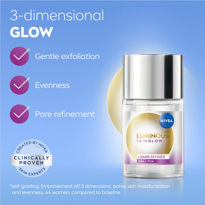 LUMINOUS630® SKIN GLOW Daily Liquid Exfoliant från NIVEA är en leave-on peeling som effektivt verkar på djupet för att ge huden fin lyster.