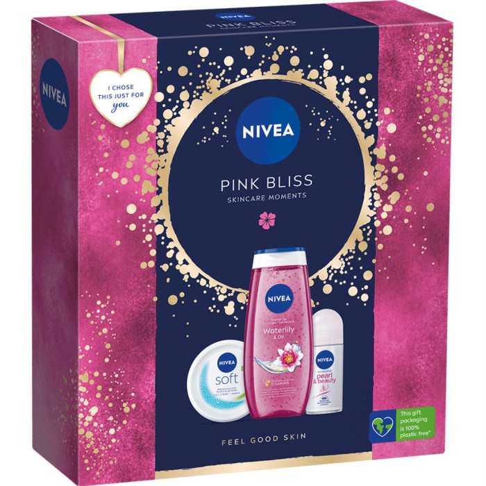 NIVEA Pink Bliss Giftpack är en presentförpackning att ge bort till någon du tycker om, eller unna dig själv. I denna presentbox från NIVEA hittar du: Waterlily & Oil Shower Gel - en vårdande frisk duschgel med doft av näckros för en återfuktad känsla. Pearl & Beauty Deo Roll-On - anti-perspirant med pärlextrakt som ger lena armhålor. NIVEA Soft Cream (200 ml) - återfuktande kräm som passar att använda både till kroppen och till ansiktet. Produkterna i detta paketet är hudvård som är utvalda att passa de flesta kvinnor. Produkterna är dermatologiskt testade.