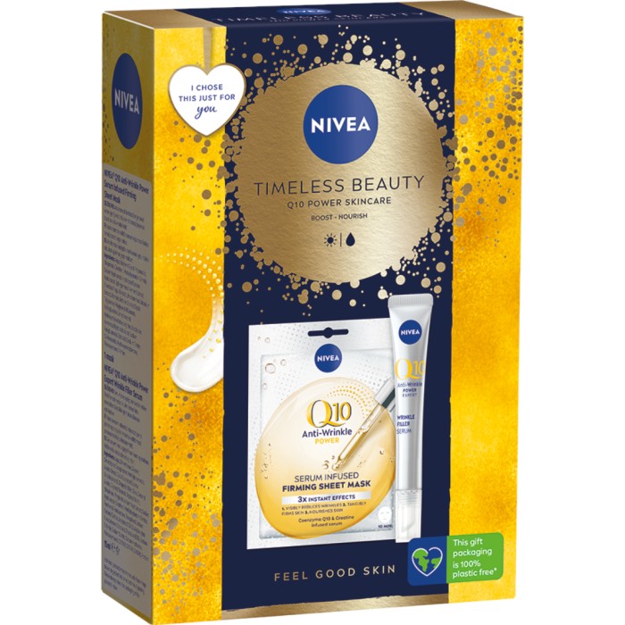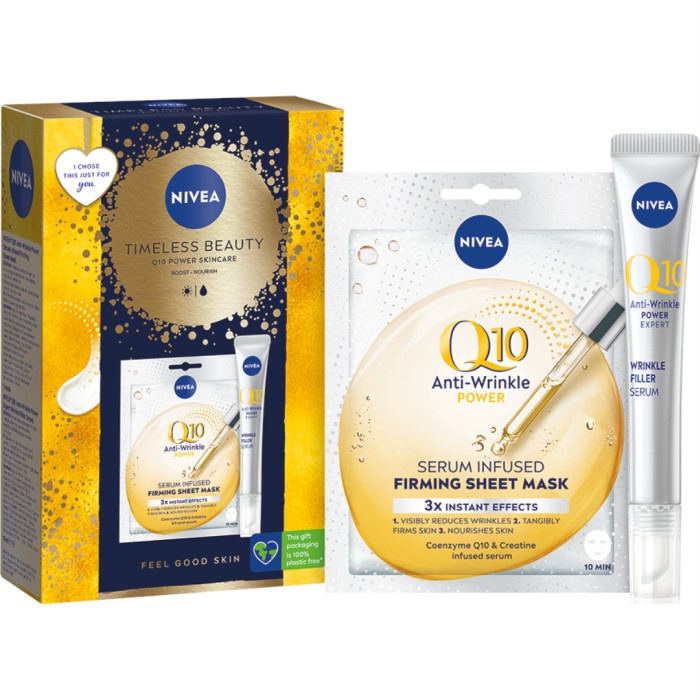 Niveas presentförpackning innehåller NIVEA Q10 Power Expert Wrinkle Filler Serum, ett avancerat ansiktsserum som reducerar envisa rynkor och förbättrar hudens elasticitet. Kitet innehåller även NIVEA Q10 Anti-wrinkle Power Serum Infused Firming Sheet Mask, en ansiktsmask som snabbt återfuktar huden och reducerar tecken på trötthet. Denna sheet mask är berikad två antioxidanter Q10 och Vitamin C.