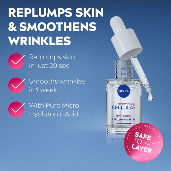 NIVEA Cellular Expert Filler Hyaluron Replumping Serum är ett avancerat ansiktsserum framtaget för att ge en återfuktad och mjukare hud. Detta ansiktsserum är berikat med ren micro-hyaluronsyra, vilket är en fuktgivande molekyl som finns naturligt i huden. Den är känd för att binda fukt och synligt plumpa huden. 40x mindre molekyler (jämfört med makro hyaluronsyra som används i andra NIVEA-produkter) tränger in i huden 10 lager djupt för en effektiv utfyllande effekt av rynkor.