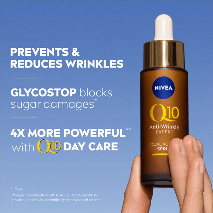 NIVEA Q10 Anti-Wrinkle Expert Dual Action Serum är framtaget för att reducera befintliga rynkor samt motverka uppkomsten av nya rynkor. Ger kliniskt bevisade resultat på bara 2 veckor med minskade rynkor för 91% kvinnor (instrumentell mätning av rynkors volym, 24 kvinnor, 2023). Den innovativa ingrediensen GLYCOSTOP verkar som en sköld genom att blockera glykering upp till 68%, för att motverka rynkor (in vitro). Serumet i kombination med Q10 ANTI-WRINKLE POWER Day Cream har 4x mer aktiv kraft än att endast använda en dagkräm (bevisad effekt på 4 vetenskapligt uppmätta fördelar för huden vid användning i kombination med Q10 Anti-Wrinkle Power Day Cream SPF15). Formuleringen är berikad med NIVEAs högsta koncentration av ren Q10. Går utmärkt att använda som bas under makeup. Detta NIVEA-serum reducerar även djupa rynkor inifrån och ut och gör att huden direkt ser mjuk ut för 97% kvinnor (självutvärdering, 113 kvinnor, 2023).