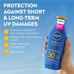 NIVEA SUN Protect & Moisture Sun Lotion SPF 30 är en solkräm med ett högt skydd som ger skydd mot lång- och kortsiktiga UVA- och UVB-skador. Den nya formulan med CitraCell-Protect med C-vitamin och hyaluron minskar hudens oxidativa stress på cellnivå (in vitro). Den nya formuleringen återfuktar huden i upp till 48 timmar. Den är vattenresistent och lämnar ingen vit hinna på huden. Passar alla hudtyper och dermatologiskt testat. Detta solskydd har en s.k. Ocean Respect-formulering som är fri från UV-filtren octinoxate, oxybenzone och octocrylene.