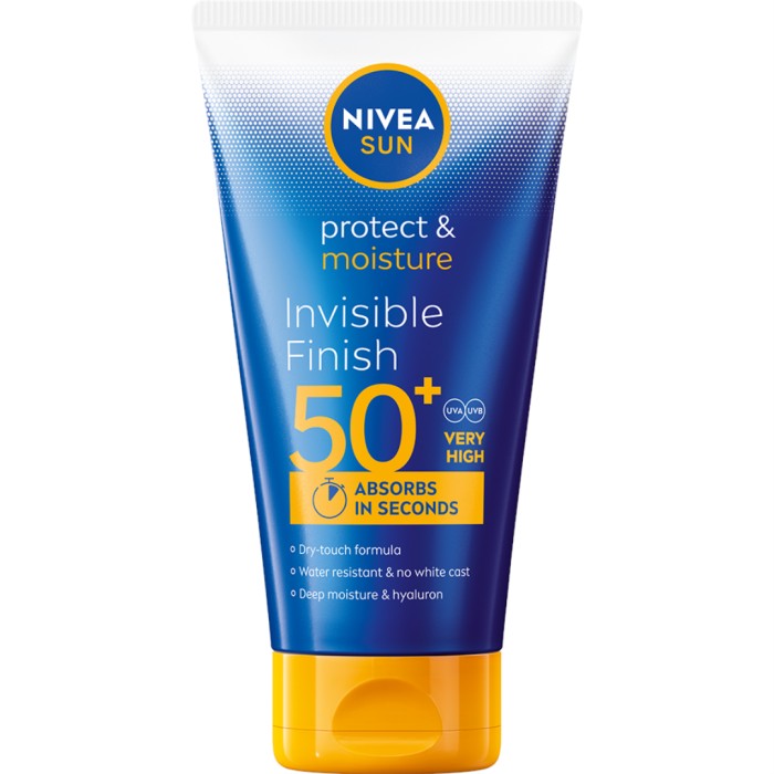 NIVEA SUN Protect & Moisture Invisible Finish Sun Lotion är en solkräm med mycket högt skydd med SPF 50+. Denna solskyddskräm med CitraCell-Protect™ med vitamin C samt hyaluron erbjuder ett avancerat skydd. Den nya formuleringen minskar oxidativ stress på cellnivå (in vitro). Invisible Finish Sun Lotion har en formulering som absorberas på bara några sekunder, och som ger huden djup återfuktning utan att lämna en vit hinna. Den ger också huden en mjuk känsla.Den milda formuleringen passar alla hudtyper. Niveas solskydd är dermatologiskt testat.