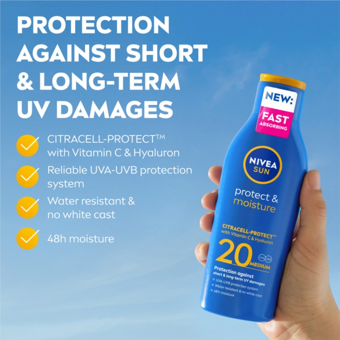 NIVEA SUN Protect & Moisture Sun Lotion SPF 20 är en solkräm med ett medelhögt skydd, som ger skydd mot lång- och kortsiktiga UVA- och UVB-skador. Sollotionen har en ny formulering med CitraCell-Protect med C-vitamin och hyaluron som minskar hudens oxidativa stress på cellnivå (in vitro). Den nya formuleringen återfuktar huden i upp till 48 timmar och lämnar ingen vit hinna på huden. Lotionen är vattenresistent. Passar alla hudtyper. Detta solskydd har en s.k. Ocean Respect-formulering som är fri från UV-filtren som octinoxate, oxybenzone och octocrylene.