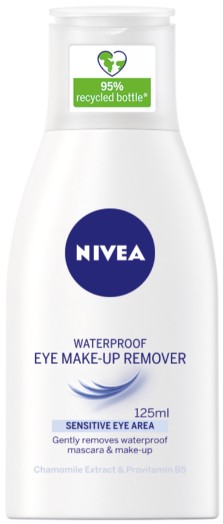 NIVEA Waterproof Eye Make-up Remover är en sminkborttagning som är speciellt utvecklad för det känsliga området runt ögonen. Niveas sminkborttagning tar bort vattenfast mascara, ögonsmink och läppstift, utan att lämna några kladdiga rester. En ögonmakeup-remover som är berikad med kamomillextrakt och provitamin B5 och återfuktar det känsliga området runt ögonen. Niveas Waterproof Eye Make-up Remover ger rena och väl omhändertagna ögonfransar. Removern har en mild doft och passar alla hudtyper. Den är dermatologiskt och oftalmologiskt testad. Lämplig för kontaktlinsbärare.