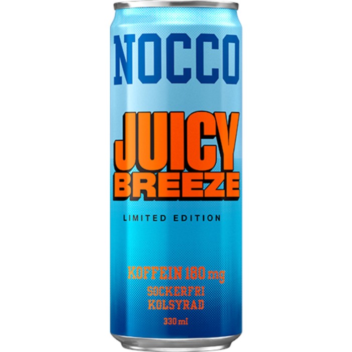 NOCCO Juicy Breeze är en kolsyrad BCAA-dryck som innehåller BCAA (grenade aminosyror), koffein och vitaminer. Juicy Breeze är framtagen som en Limited Edition-smak för sommaren 2022 och har en tropisk och mer "juicig" smak än övriga Nocco. Sockerfri. Innehåller sötningsmedel.