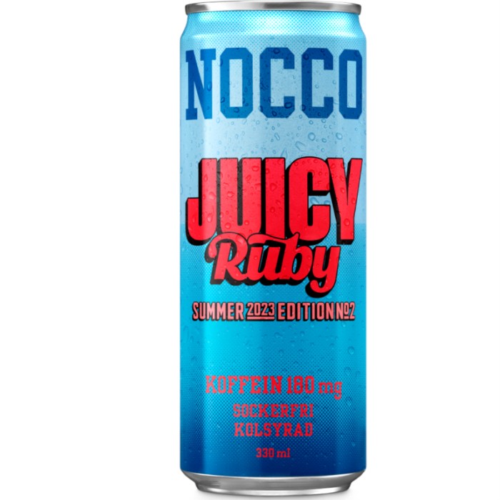 NOCCO Juicy Ruby Summer 2023 är en kolsyrad dryck som innehåller BCAA (grenade aminosyror), koffein och vitaminer. Juicy Ruby är en Limited Edition-smak framtagen för sommaren 2023 och har en smak av hallon. Innehåller sötningsmedel.