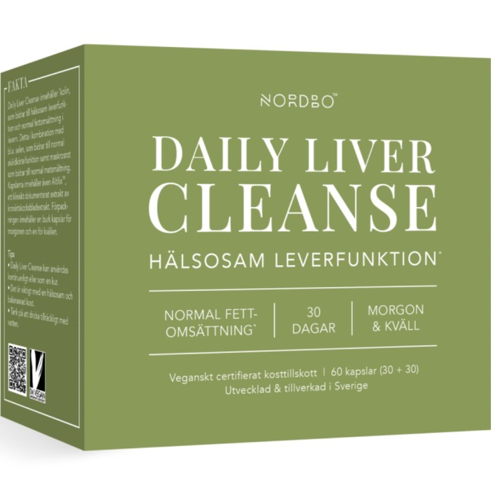 Nordbo Daily Liver Cleanse är ett kosttillskott som innehåller 9 aktiva ingredienser och har en formulering för dagen och en för natten. Daily Liver Cleanse innehåller Altilix™, ett extrakt av kronärtskocksblad, som har ett högt innehåll av antioxidanter, främst biofenoler och flavonoider. Daily Liver Cleanse innehåller även kolin, ett B-vitaminliknande ämne som bidrar till bibehålla normal leverfunktion och normal fettomsättning. Daily Liver Cleanse innehåller kolinbitartrat, en form av kolin med hög biotillgänglighet.