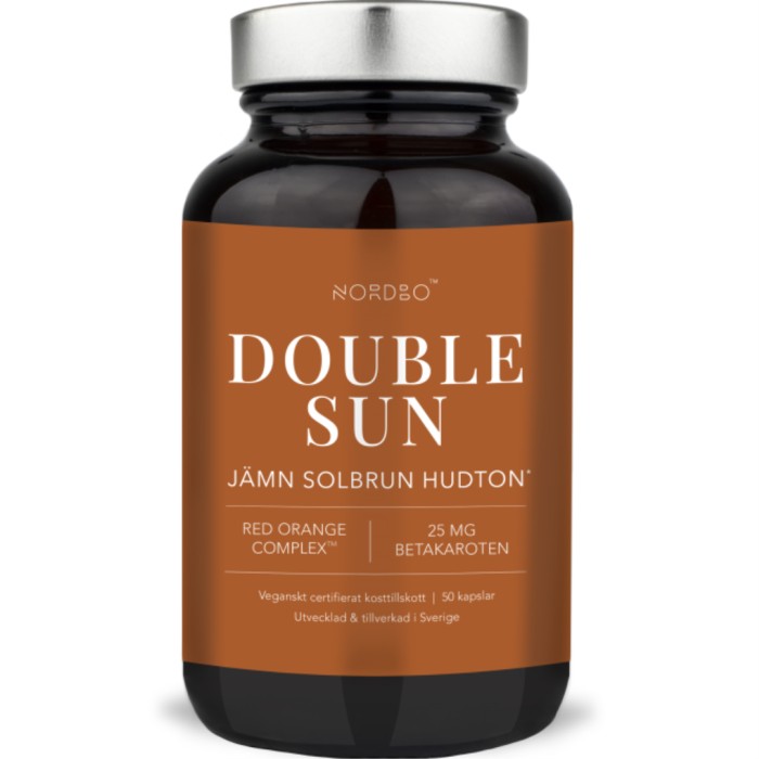 Nordbo Double Sun är ett kosttillskott som innehåller blodapelsinsextraktet Red Orange Complex™ och betakaroten från mikrosvampen Blakeslea trispora. Betakaroten är en färgstark antioxidant som ger bär, frukter och grönsaker dess gula och orange färg. Betakaroten är ett förstadium till A-vitamin. Red Orange Complex™ innehåller extrakt av tre sicilianska blodapelsiner: Moro, Tarocco och Sanguinello. Blodapelsinerna blir ovanligt pigmentsrika tack vare den stora temperaturväxlingen mellan dag och natt på Sicilien.