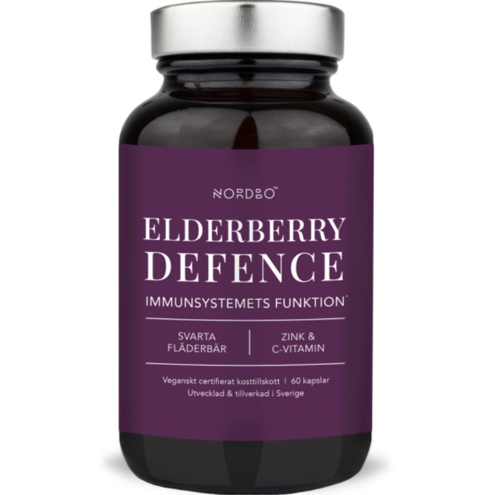 Nordbo Elderberry Defence är ett kosttillskott som innehåller fläderbärsextrakt av Sambucus Nigra (svart fläderbär), syraneutral C-vitamin och zinkpikolinat.