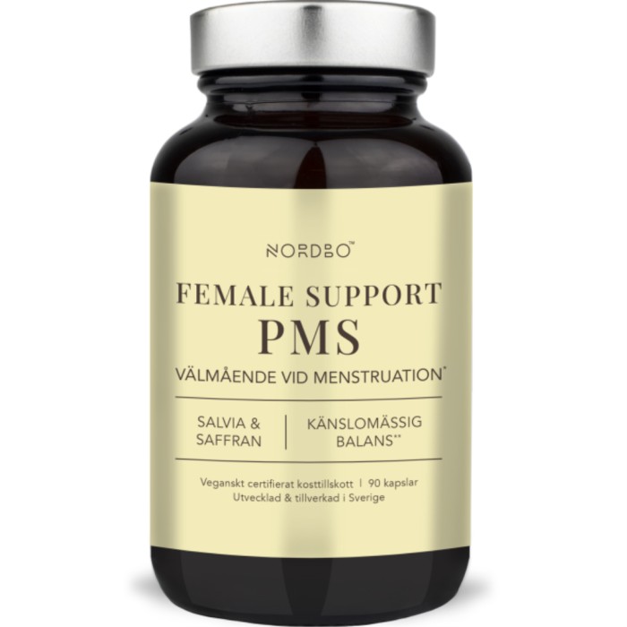 Nordbo Female Support PMS är ett kosttillskott med 10 aktiva ingredienser, bl.a. saffran, salvia, rödklöver, magnesium, ingefära, vitamin B6 och matsmältningsenzymer. Det standardiserade saffransextraktet innehåller 10% krokiner, ett aktivt ämne som ger saffran dess gula färg. Rödklöver är en ärtväxt som innehåller isoflavoner, d.v.s. fytoöstrogena föreningar. DigeZyme® är ett enzymkomplex med amylas, proteas, laktas, lipas och cellulas. Enzymerna bryter ned kolhydrater, protein, fett, laktos och cellulosa. Vitamin B6 (pyridoxin) bidrar till att bibehålla hormonell hälsa. Magnesium bidrar till minskad trötthet och utmattning samt till att bibehålla normal muskelfunktion.