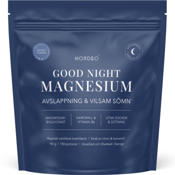 Good Night Instant Magnesium är ett kosttillskott i pulverform med magnesiumbisglycinat som har hög biotillgänglighet, kamomillextrakt och vitamin B6. Magnesiumbisglycinat innebär att magnesium har bundits till aminosyran glycin, vilket förbättrar upptaget samt gör mineralen skonsam för magen.