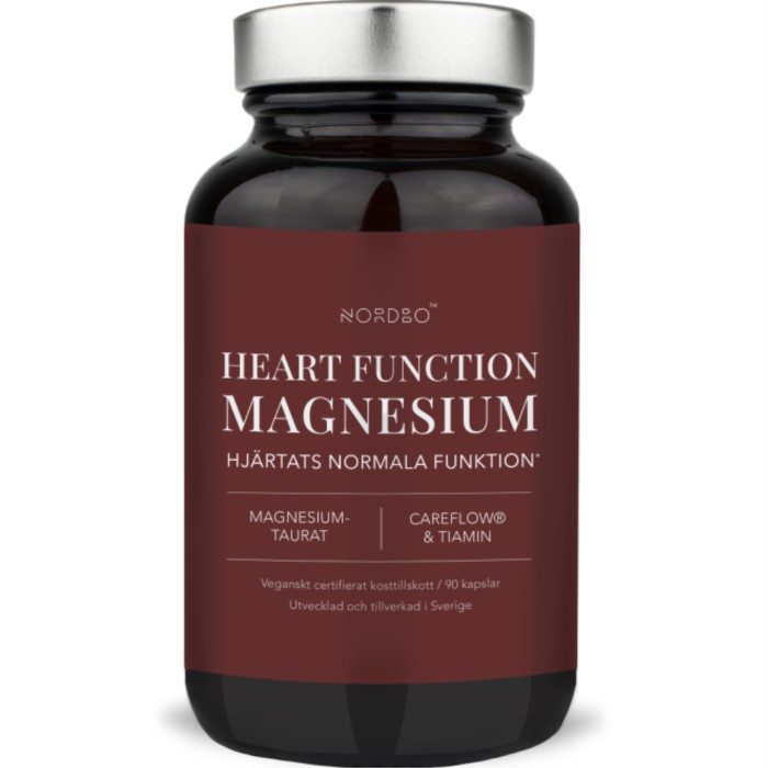 Nordbo Heart Function Magnesium är ett kosttillskott som innehåller en kombination av tiamin, magnesiumtaurat och CareFlow®. Tiamin är ett vattenlösligt coenzym (tidigare vitamin B1) som bidrar till hjärtats normala funktion. Tiamin kan inte produceras av kroppen själv, utan måste tillföras via kosten. Magnesiumtaurat består av magnesium bundet till aminosyran taurin. Taurin är den aminosyra som är vanligast förekommande i hjärtat. Genom att binda magnesium till taurin förbättras biotillgängligheten. Magnesium bidrar till minskad trötthet och utmattning, normal muskelfunktion och normal kognitiv förmåga. CareFlow® är ett mangoextrakt med kliniskt dokumenterad effekt. Utvecklad och tillverkad i Sverige. Veganskt certifierad av Djurens Rätt.