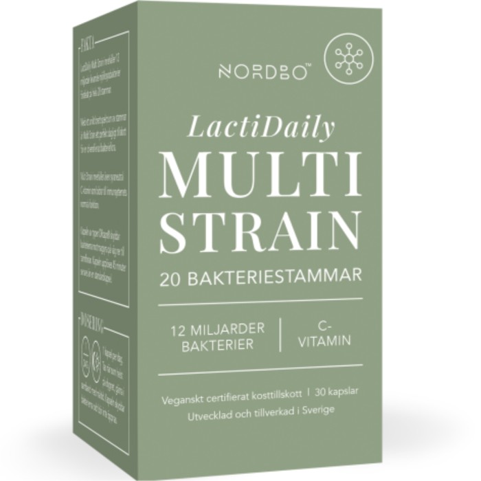 Nordbo LactiDaily Multi Strain är ett kosttillskott med kapslar som innehåller 12 miljarder levande mjölksyrabakterier fördelat på 20 stammar. Nordbo Multi Strain innehåller även syraneutral C-vitamin av kalciumaskorbat, som bidrar till att bibehålla immunsystemets normala funktion. Kapseln av typen DRcaps® som skyddar bakterierna i kapseln mot magsyra, och utlöses ca 45 minuter senare än en standardkapsel. Kan tas dagligen.