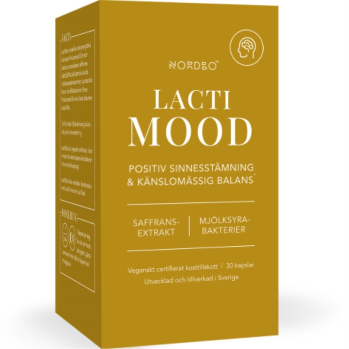 Nordbo Lactimood är ett kosttillskott i kapselform som innehåller det patenterade och väldokumenterade komplexet Probiostress®, som kombinerar30 mg standardiserat saffransextrakt med 4 miljarder levande mjölksyrabakterier från två probiotiska stammar: Lactobacillus Reuteri och Bifidobacterium Breve.