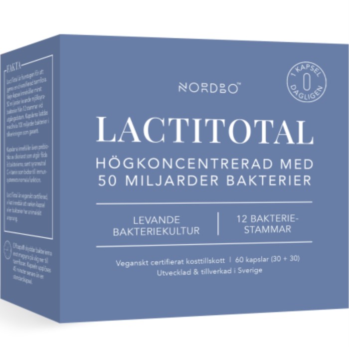 Nordbo LactiTotal är ett kosttillskott med mjölksyrabakterier som innehåller 50 miljarder mjölksyrabakterier fördelat på 12 stammar. LactiTotal innehåller både Lactobacillus- och Bifidobacterium-stammar. Kapslarna innehåller även inulin (kostfibrer som utvinns ur cikoriarot) och syraneutral C-vitamin. C-vitamin bidrar till att bibehålla immunsystemets normala funktion. Kapseln är av typen DRCaps® och löses upp långsammare än en standardkapsel, för att skydda mjölksyrabakterierna mot magsyra.