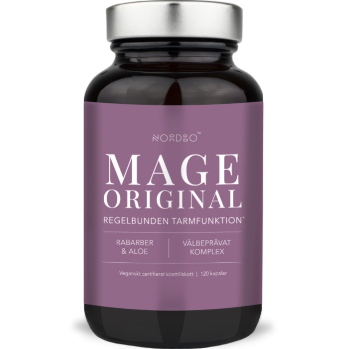 NORDBO Mage Original är ett kosttillskott som innehåller rabarberrot, magnesiumhydroxid och triphala, det senare är en traditionell ayurvedisk blandning av indiskt krusbär, baherafrukt och tropisk mandel (inte besläktad med vanlig mandel). Kapslarna innehåller även aloe vera, läkemalva och rödalmsbark.
