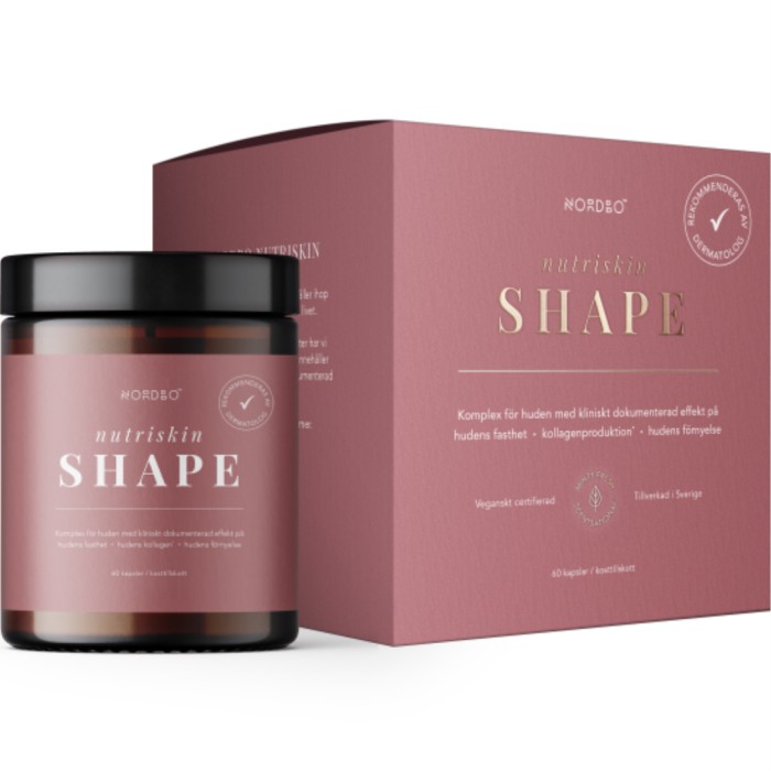 Nutriskin Shape från Nordbo är ett kosttillskott med ett komplex för mogen hy med kliniskt dokumenterad effekt på hudens fasthet, kollagenproduktion och förnyelse. Shape innehåller drakblomsextraktet DracoBelle™, vars effekt är dokumenterad i en klinisk studie med fokus på de viktigaste parametrarna för hudens fyllighet. DracoBelle™ vann Ingredient of the Year på Nutra Ingredients Asia Awards 2022.