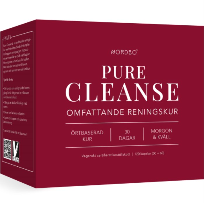 Nordbo Pure Cleanse är en 30-dagars örtkur som innehåller bland annat kronärtskocka, gurkmeja, rabarber, magnesium, chlorella och spirulina. Förpackningen innehåller 60 + 60 kapslar. Den ena kapseln tas på morgonen, den andra på kvällen. (2 kapslar per tillfälle.) Vegansk.