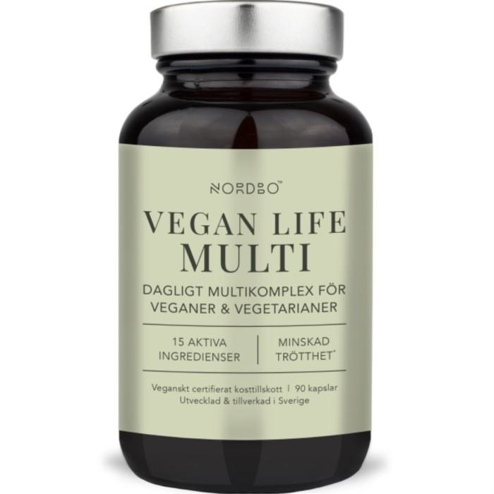 Nordbo Vegan Life Multi är ett kosttillskott framtaget för veganers och vegetarianers dagliga behov. Vegan Life Multi innehåller 15 aktiva ingredienser, bl.a. B12, järn, magnesium och ginseng.